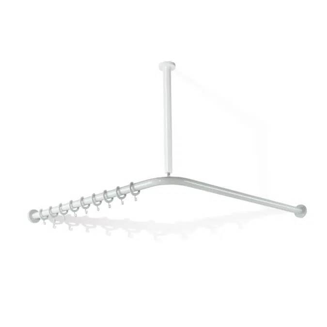 Range 801 Shower curtain rail - horizontal rails joined to form a right angle and fitted with curtain rings - for installing a shower curtain - with aluminium core - fixing with roses to wall and ceiling, ceiling support required - can be shortened at the ends on site - with 24 curtain rings - for shower tray 1200 x 1200 mm (centre-to-centre 1183 x 1183 mm), rail diameter 33 mm, rose diameter 70 mm - length at rose ends can be shortened on site up to 500 mm - made of high-quality polyamide according to HEWI colour chart Article no.: HEWI 801.34.110