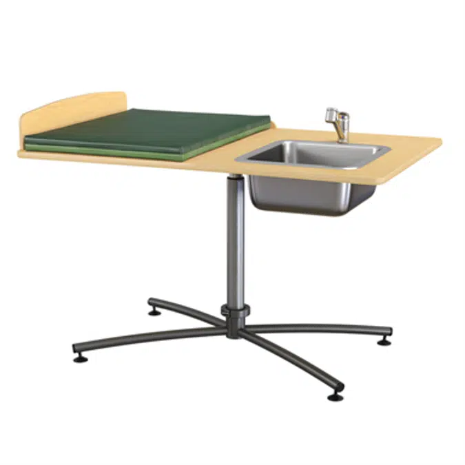 Skötbord Manuela 120h ist ein manuell höhenverstellbarer Wickeltisch. Mittels einer Gasdruckfeder ist es mit sehr geringem manuellen Aufwand möglich, den Wickeltisch anzuheben und abzusenken. Sie können die Arbeitshöhe stufenlos zwischen 75-105 cm einstellen. Die Wickelkommode hat einen rechts in die Tischfläche eingelassenen Waschplatz und ist mit einer phthalatfreien Matratze, hohen Rändern, einer Mischbatterie mit ausziehbarer Dusche und Ablaufdetails ausgestattet. Erhältlich in Birke oder weißem Laminat.