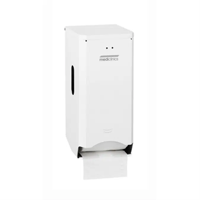 Teilenummern: PR2784 Toilettenpapierspender für Doppelrollen, Fassungsvermögen 2 Rollen, aus Stahl 0,8 mm. dick, wandmontiert, entworfen und hergestellt von Mediclinics®, SA Diese Modelle sind für den Einsatz in Restaurants, Büros, Krankenhäusern usw. konzipiert und bieten ein geeignetes Design für eine einfache Badezimmerintegration. Diese aus einem Stück gefertigten Spender für Toilettenpapierrollen sind in weißem Epoxy®-Finish erhältlich. Diese Rollen-Toilettenpapierspender-Modelle haben ein funktionelles, robustes und trendiges Design, das zu der neuen Bad-Accessoires-Serie von Mediclinics® passt. Dadurch fügt sich dieser Rollen-Toilettenpapierspender perfekt in jeden Raum ein. Darüber hinaus verfügen diese Toilettenpapierspender über zwei Füllstandsanzeigen auf beiden Seiten des Körpers, die ständig den Füllstand des verfügbaren Papiers anzeigen und anzeigen, wann die Papierrolle ausgetauscht werden muss. Mit einer Kapazität von zwei Standardrollen verfügen diese Rollen-Toilettenpapierspender-Modelle über einen automatischen Mechanismus, der bewirkt, dass die nächste Rolle fällt, sobald die unterste Rolle verwendet wurde. Es handelt sich um eine Kunststoffhalterung für die Reservepapierrolle, die je nach Größe der Papierrolle in zwei verschiedene Positionen reguliert werden kann und die freie Bewegung der verwendeten Rolle ermöglicht. Die Papierrolle fällt, wenn die vorherige verbraucht ist, durch eine einfache Manipulation durch die seitlichen Füllstandsanzeigen.
