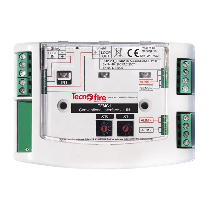• Addressable interface composed of 1 supervised physical/logical unit: 1 input for conventional devices Opto-isolated power supply input for conventional detectors – Programmable functions: prealarm signaling – Input status LED – Integrated RSC® technology: programming, remote management of all functioning parameters – Dual loop isolator – Connection to loop – Proprietary high-speed protocol Fire-Speed – Mounting on the surface or DIN rail TFDIN – IP40 – Casing ABS V0 – Dimensions (L x H x D) 112 x 78 x 25mm – White color EN 54-18:2005/AC:2007 – EN 54-17:2005 – Certification number 1293-CPR-0492