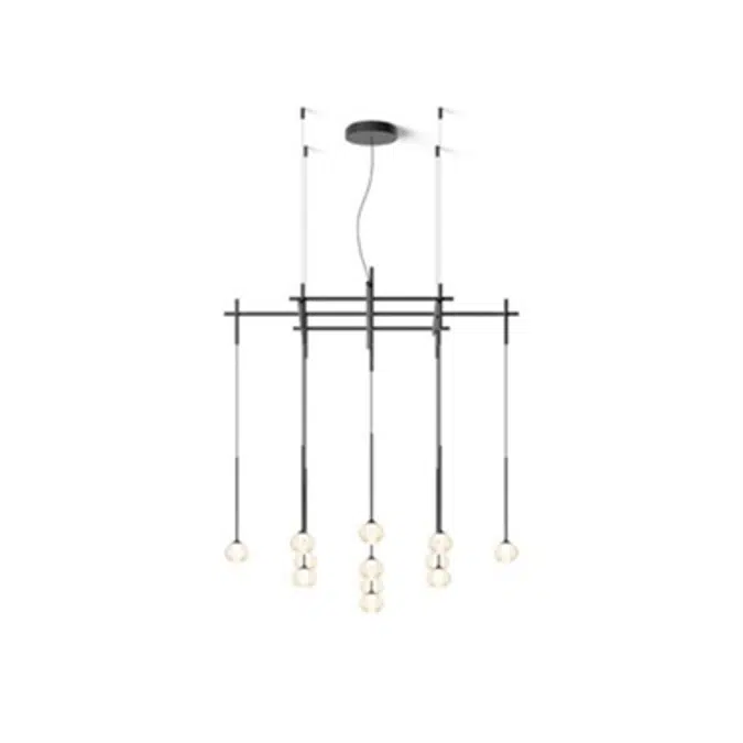 Pendelleuchte entworfen von Toan Nguyen. Bestehend aus einer Sammlung von mundgeblasenen Glaskugeln mit LED-Lichtquelle, die in verschiedenen Höhen aufgehängt und über eine schwebende Röhrenstruktur an der Decke verankert sind.