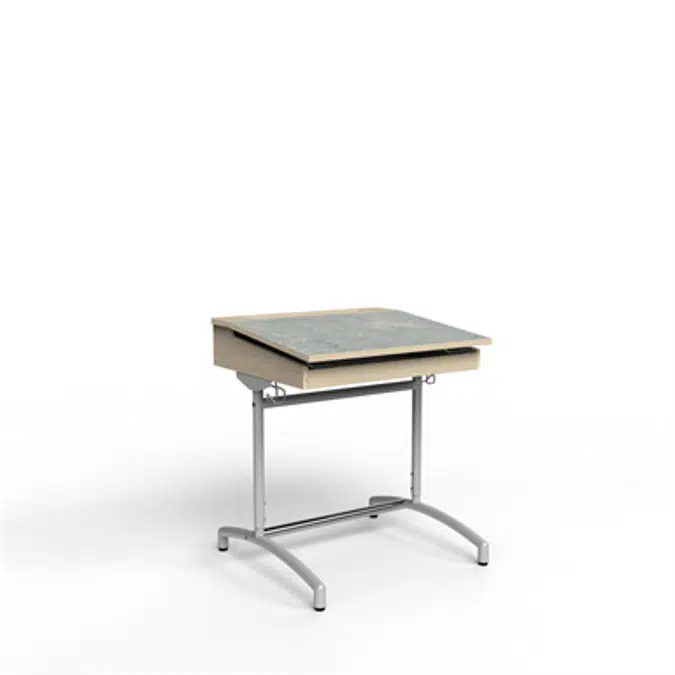 Schulbank mit grau pulverbeschichtetem Stahlrahmen, höhenverstellbar 70 - 100 cm. Mit verstellbaren Füßen und doppelten Taschenhaken. Die Schublade ist aus massiver Birke. Die kippbare Schubladenabdeckung hat eine Oberfläche, die mit schallabsorbierendem Linoleum Marmoleum Decibel ausgelegt ist, einem natürlichen Material, das den Schall um 17 dB reduziert und mit dem Nordic Ecolabel gekennzeichnet ist.
