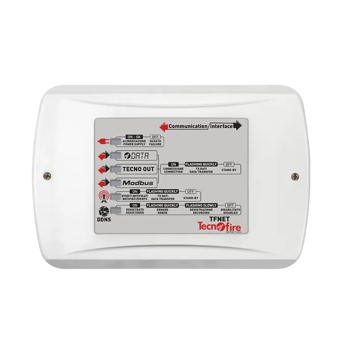 • Ethernet interface with 8 channels for event notification - Transmission formats: Data, Email - AES 128 bit and AES 256 bit data encryption - Independent passphrase for each channel - Self test of communication vectors, power supply, serial bus communication - Front panel with 6 status LED - Integrated RSC® technology: programming, remote management of all functioning parameters - RS485 serial connection - Surface mounting - IP30 - ABS V0 casing - Dimensions (L x H x D) 165 x 110 x 41mm - White color