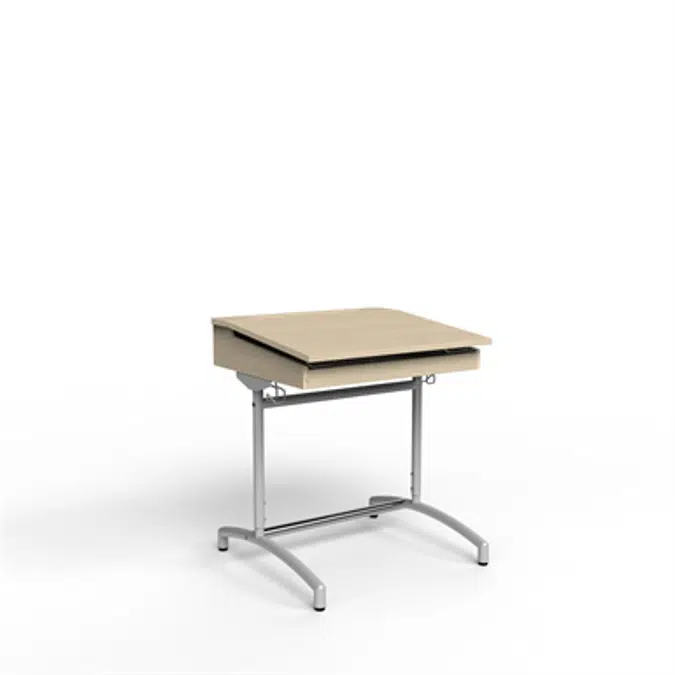 School desk with gray powder-coated steel frame, height adjustable 70 - 100 cm. With adjustable feet and double bag hooks. The drawer is in solid birch. The tiltable drawer cover has a surface of high pressure laminate in birch.
