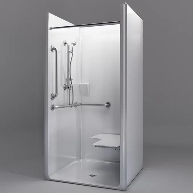 One-piece transfer shower stall for new builds. Features inside dimensions of 36" x 36" for ADA compliance, a ¾″ low threshold, double receiver flange, pre-leveled base, reinforced walls, smooth wall finish, durable applied acrylic, 30-year warranty, made in the USA. Order with factory-installed folding seat, grab bars, and accessories to meet ADAAG guidelines.