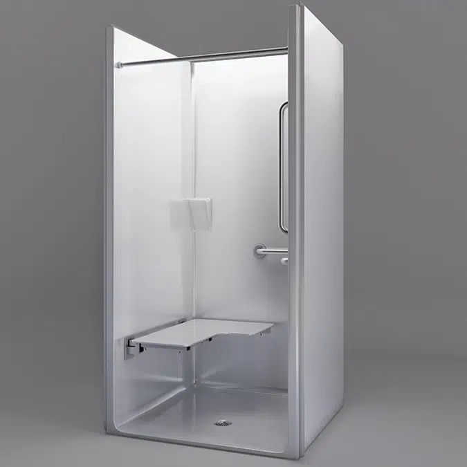 One-piece transfer shower stall for new builds. Features inside dimensions of 36" x 36" for ADA compliance, a ¾″ low threshold, double receiver flange, pre-leveled base, reinforced walls, smooth wall finish, durable applied acrylic, 30-year warranty, made in the USA. Order with factory-installed folding seat, grab bars, and accessories to meet ADAAG guidelines.