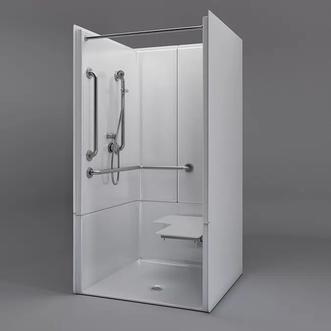 Three-piece ADA transfer shower stall ideal for remodels. Features inside dimensions of 36" x 36" for ADA compliance, a 7/8″ beveled threshold, center drain, pre-leveled base, reinforced wood-backed walls, double receiver flange, built-in soap ledge, durable acrylic finish, 30-year warranty, made in the USA. Order with a factory-installed folding shower seat, grab bars, and other shower accessories to meet ADAAG guidelines.