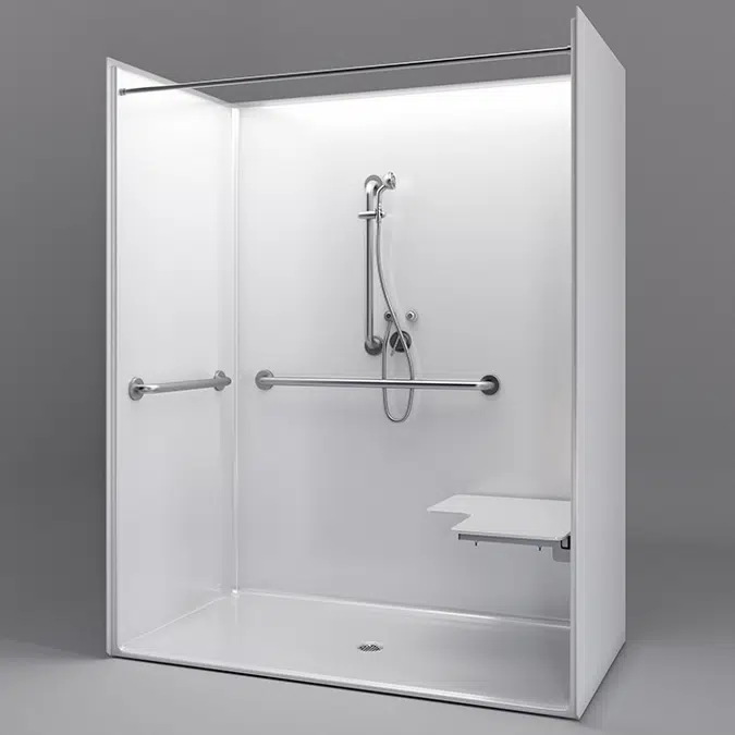 One-piece ADA roll-in shower stall for new construction. Inside dimensions 60″ x 30″ for ADA compliance, 7/8″ beveled threshold, pre-leveled base, fully backed walls, smooth-wall durable applied-acrylic finish. 30-year warranty, made in the USA. Order with factory-installed folding seat, grab bars, and accessories to meet ADAAG guidelines.