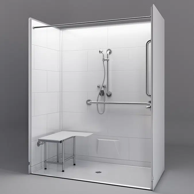 Five-piece ADA roll-in shower stall for remodels. Inside dimensions 60″ x 30″ for ADA compliance, 1″ beveled threshold, right drain, pre-leveled self-supporting base, fully reinforced walls, subway-tile look with durable applied-acrylic finish. 30-year warranty, made in the USA. Order with a folding shower seat, grab bars, and accessories to meet ADAAG guidelines.