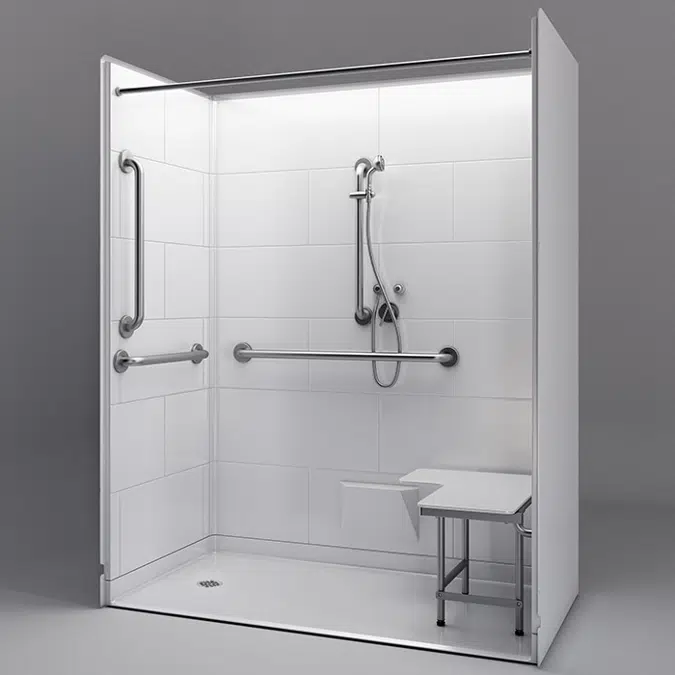 Five-piece ADA roll-in shower stall for remodels. Inside dimensions 60″ x 30″ for ADA compliance, 1″ beveled threshold, left drain, pre-leveled self-supporting base, fully reinforced walls, subway-tile look with durable applied-acrylic finish. 30-year warranty, made in the USA. Order with a folding shower seat, grab bars, and accessories to meet ADAAG guidelines.