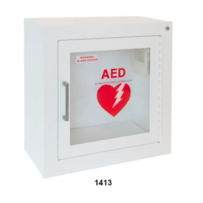 Door: Formed door with 1-1/4” trim, with a 5/8” door stop are attached by a continuous hinge and equipped with zinc-plated handle and roller catch. View AED through a clear acrylic window with graphics.