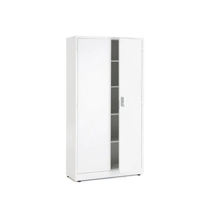 Lockable storage cabinet for secure storage. The cabinet has adjustable shelves and adjustable feet
