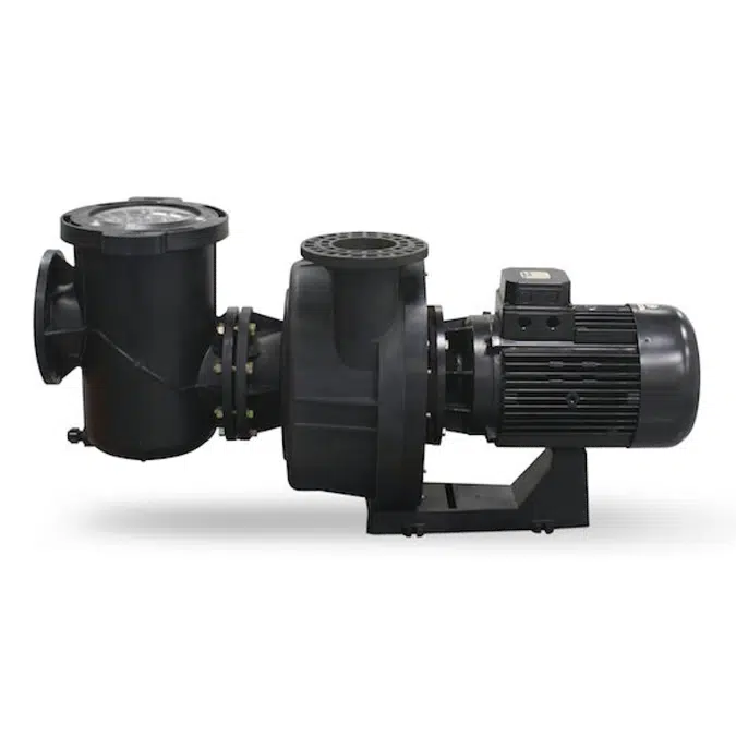 Kivu Centrifugal Pump. High performance plastic centrifugal pump for public pools operating at 1500 rpm. • 3 power ratings: 7.5 hp, 10 hp and 15 hp. • Low sound level: as low as 66 dBA. • Hydraulic efficiency without pre-filter 85% (ISO 9906 standard),. • High quality mechanical seal for salt water. • High efficiency IEC motors (IE3). • Standard motor shaft (compatible with any pump manufacturer). • GS marked product. • Pump comes with pre-filter (in 2 packages: pump • pre-filter).