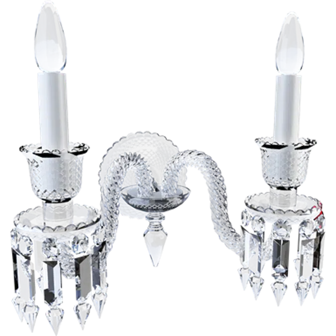 Crystal wall unit made of a central cup with diamond bevelled cut and twisted arms made according to the great crystal making tradition and adorned with octagons and arrowed prisms. A red crystal octagon represents Baccarat’s signature. Several options for staging your wall unit: with or without lampshade or hurricane shade.