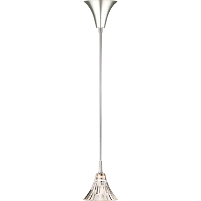Mille Nuits tulip-shaped cup in bevelled cut crystal. To be harmonious with the crystal, the electric wire is sheathed in transparent plastic for CEI and JETRO versions, and metalized for the UL one; adjustable height up to 98.4 inches. The canopy is in brushed aluminum and the cable clamp is in velvet chrome finish brass.