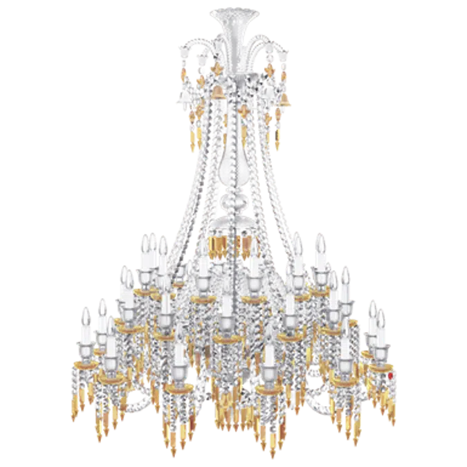 Chandelier comprising a central column with decoration in bevelled diamond cut crystal and cabled branches in the grand tradition of glassmaking. The strength of this chandelier lies in the wealth of its ornamentation comprising cascades of spiked champagne prisms alternating with festoons of octagons and scrolls holding bellcaps with sparkling pendants. A red crystal octagon represents the Baccarat signature. Two options for displaying your chandelier: with or without lampshade or hurricane shade.