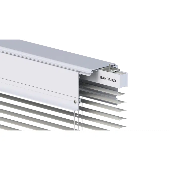 Aluminium Venetian blind built into the Bandalux ONE BOX concealed system for quick, screw-free installation of the blind at a later date. It can be opened and closed for easy maintenance.