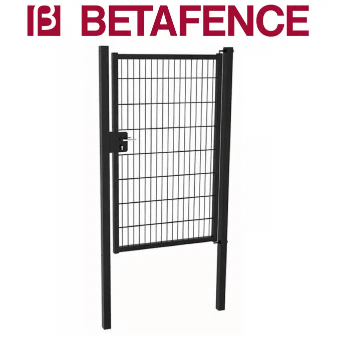 Perimeter security single leaf swing gate, including welded mesh infill, adapted posts, hinges, and lock and ground bolt system.