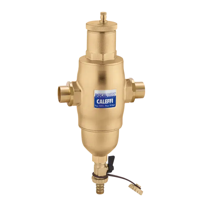 Air and dirt separators are used to continuously remove the air and debris contained in the hydronic circuits of heating and cooling systems. The air discharge of these devices is very high. They are capable of automatically removing all of the air present in the system down to the microbubble level. The DISCALDIRT® air and dirt separator also removes any solid impurities in the system. The impurities collect at the bottom of the device and can be flushed through the integral drain shut-off valve. The circulation of fully de-aerated and cleaned water enables the equipment to operate under optimum conditions, free from noise, corrosion, or mechanical damage. Insulation shells are available separately for field installation on the brass DISCALDIRT®.