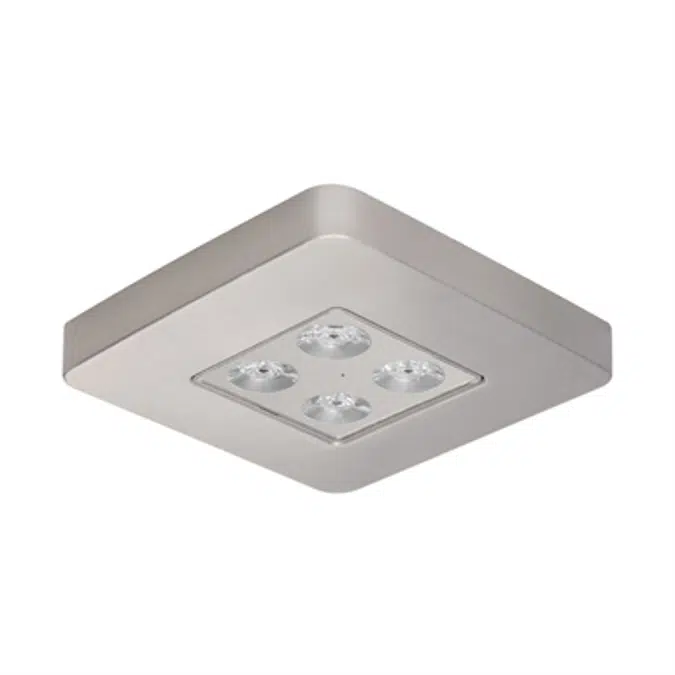 Square, extra slim emergency luminaire. The frame, manufactured in aluminium, in addition to the sink is the support for the electronic system and the optical group. The combined use of specific lenses and reflectors ensure optimum performance in open area lighting and escape routes. Suitable for ceiling mounting. Supports AC and DC voltage. Luminaire suitable for centralised AC/DC power systems.