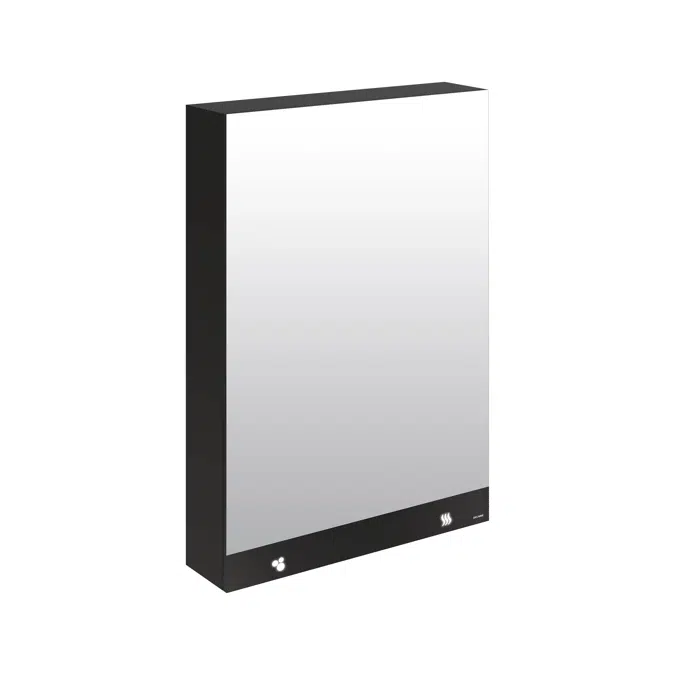 Mirror cabinet with 3 functions: mirror, electronic soap dispenser and electrical hand dryer. 304 stainless steel designer cabinet with a matte black melamine finish. Touch-free for improved hygiene: soap dispenser and hand dryer are activated automatically when hands are detected by infrared sensor. Quick and easy to install: - A single electrical connection for all the elements: mains supply with 230V / 50-60Hz. - Concealed fixings. Mirror cabinet supplied with stainless steel screws for concrete or reinforced wood. - Adjustable hinges. Unit with 3 functions: 4mm thick glass mirror and black glass strip with illuminated pictograms. Automatic soap dispenser: - No-waste pump dispenser. - Large capacity tank: 5 litres. - Suitable for vegetable-based liquid soap with a maximum viscosity of 3,000 mPa.s or specific foam soap. Air-pulse hand dryer: - High-speed. - Pulsed air at 360km/h. Airflow: 36 l/second.. - Low energy consumption: 704W. - Noise level: 74 dBA. - Class I, IP23. - 3-year warranty. Basin lit by the LED strip. Vandal-resistant model with standard DELABIE key. Anti-blocking: stops automatically if used continuously. Internal storage shelf. Several cabinets can be installed side-by-side to create a mirror wall: linking screws are provided. Dimensions: 600 x 223 x 1,000mm. Weight: 29kg. Mirror cabinet with 30-year warranty. CE marked.