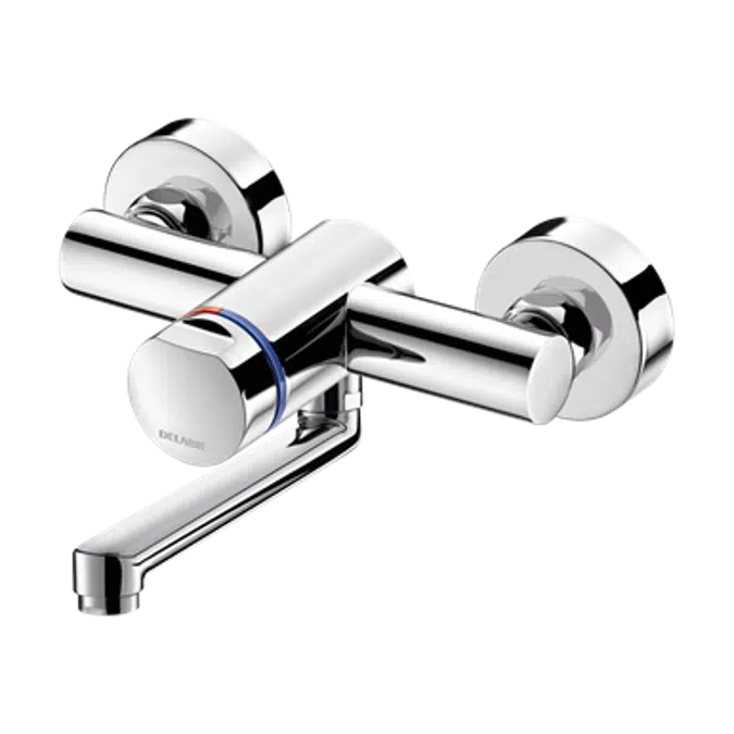 Wall-mounted single control time flow basin mixer: Soft-touch operation. Temperature control and operation via the push-button. Time flow pre-set at ~7 seconds. Flow rate pre-set at 3 lpm at 3 bar, can be adjusted from 1.4 - 6 lpm. Scale-resistant flow straightener. Chrome-plated metal body M½". Swivelling spout L. 150mm. Filters and non-return valves. Adjustable maximum temperature limiter. M½" offset connectors for centres from 130 - 170mm. Suitable for people with reduced mobility. 30-year warranty.