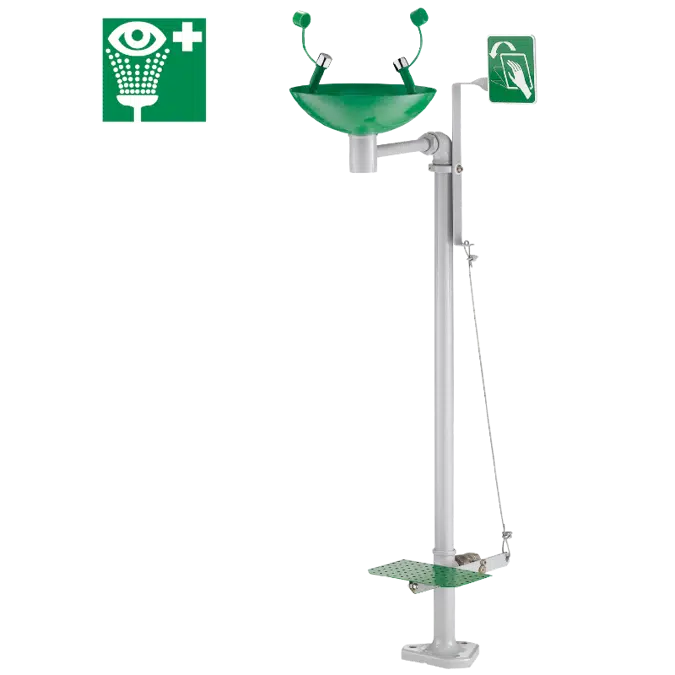 Free-standing eye wash station with manual and pedal control equipped with: Frost-free system as standard. 304 stainless steel basin Ø 250mm, green powder-coated finish. 2 eye wash spray heads fitted with protective caps in shock-resistant green ABS; will eject automatically when activated. 1/4-turn, nickel-plated brass valves open and close quickly. 30-year warranty. Operation: Water flow is activated by hand or foot control. The eye wash will continue to operate when the hand or foot control is released. To stop the flow, pull the hand control in the opposite direction and raise the pedal with your foot. Flow rate 20 lpm at 3 bar dynamic pressure. Aerators with stainless steel double filters. Water supply F1". Pipework made from galvanised steel, grey powder-coated finish. Hand and foot controls in green powder-coated galvanised steel. Fixed to the floor by a triangular brass plate (screws not included.) Supplied with identification sign for first aid equipment: "Eye Wash".