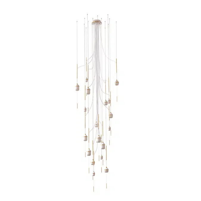 Inspired by the idea of wind chimes or rain sticks, the Fleur de Kaolin chandelier is a 100% French jewel. Poetic and refined, this pendant light with its vertical design brings a touch of preciousness to your home, and is ideal in a living room, hallway or above a table... Composed of 18 lampshades in three different sizes, made from the finest Limoges porcelain by Haviland (Infini pattern), complemented by brushed brass elements that extend the pendant like a mobile playing with the nobility of the materials. The eighteen 3W LED bulbs are supplied with the luminaire. Also available with 6 and 12 modules, depending on your ceiling height.