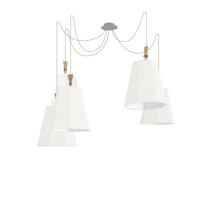 Inspired by the faceted shape of the Italian cafetière, Luxiole is a full-bodied collection for those who love naturalness and simplicity. The ingenious ceiling-mounting system and long textile cords allow several areas of the room to be generously lit from a single electrical supply. The five shades of the XXL chandelier, which are of an extraordinary size, can be scattered or grouped in clusters. The distance between the shades and the ceiling rose is adjustable, which also means you can play around with the height of the shades, making it ideal for large rooms. Suspended by beige textile cords, the fabric shades, light grey with a salmon border on the outside and white on the inside, are complemented by a beech handle. This chandelier is available in three sizes.