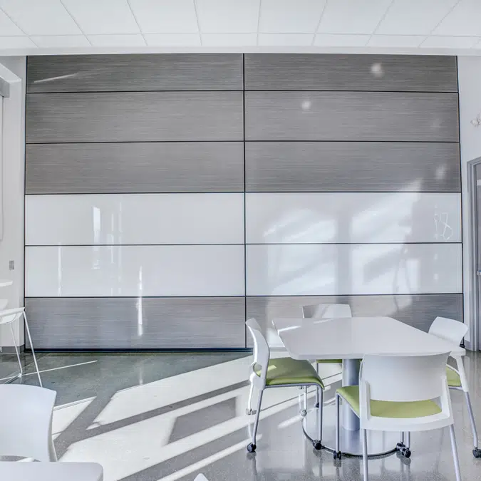The Skyfold Zenith is a custom built, vertical operable wall system that unites acoustics, flexibility, design, and performance. It offers industry-leading acoustic soundproofing indexes of STC 48, 51, 55, and 60 to ensure that privacy and confidentiality are respected from one space to another. Also available with noise reduction, the Zenith NRC (noise reduction coefficient) reduces ambient noise within spaces while still maintaining an STC of 50. Zenith has a straight down descent. With the its narrow path of travel, you don’t have to overhaul the placement of anything in the space to operate the partition wall. Advantages: Retracts into the Ceiling to Maximize Floor Space, Industry-Leading STC ratings, No Floor Tracks Wall Tracks or Visible Hinges, Fully Automatic, Easy-to-Use Turn-Key or Digital Keypad Operation, Quiet Operation, Lightweight Panels that are Flat and Rigid, Cost-Effective and Lightweight Structure, Variety of Finish Options, Can be Installed to Meet at 90°, Can be used in Stepped or Sloped Spaces, Equipped with a Safety Obstruction Sensor, Narrow Path of Travel, Made to Last