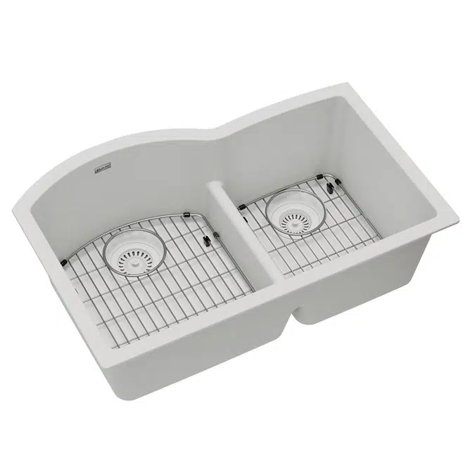 Quartz Classic® 33" x 22" x 10" Offset 60/40 Double Bowl Undermount Sink Kit with Aqua Divide. Sink is molded with up to 80% natural quartz and high performance acrylic resins that are non-porous providing superior heat, scratch, fade and stain resistance. Naturally sound deadening and Rear Center drain placement.