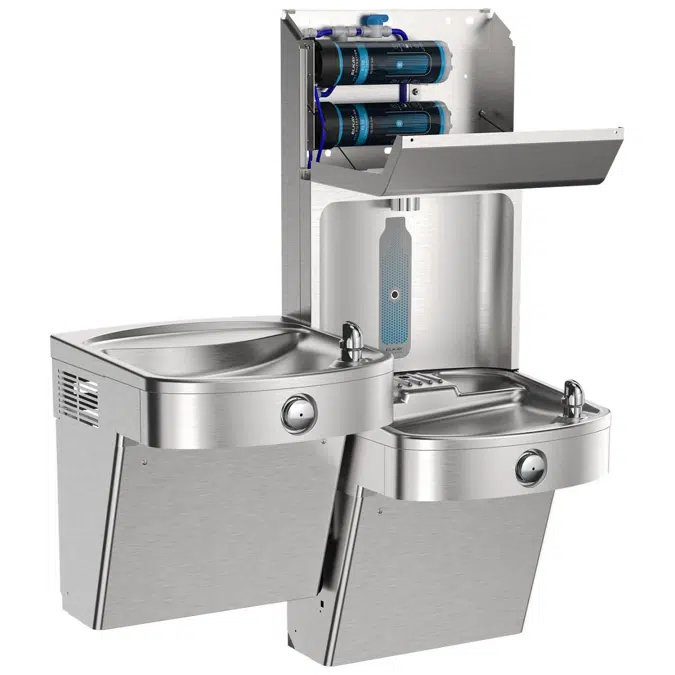 Elkay Pro Filtration® Vandal-Resistant Connected Bottle Filling Station&BiLevel ADA Clr Refrig Dbl Ultra-Cap Lead Rd SS. Chilling Capacity of 8.0 GPH (gallons per hour) of 50 F drinking water, based on 80 F inlet water and 90 F ambient, per ASHRAE 18 testing. Furnished with Vandal Resistant bubbler. Electronic Bottle Filler Sensor with Mechanical Front Bubbler Button activation. Product shall be Wall Mount (On Wall), for Indoor applications, serving 2 station(s).