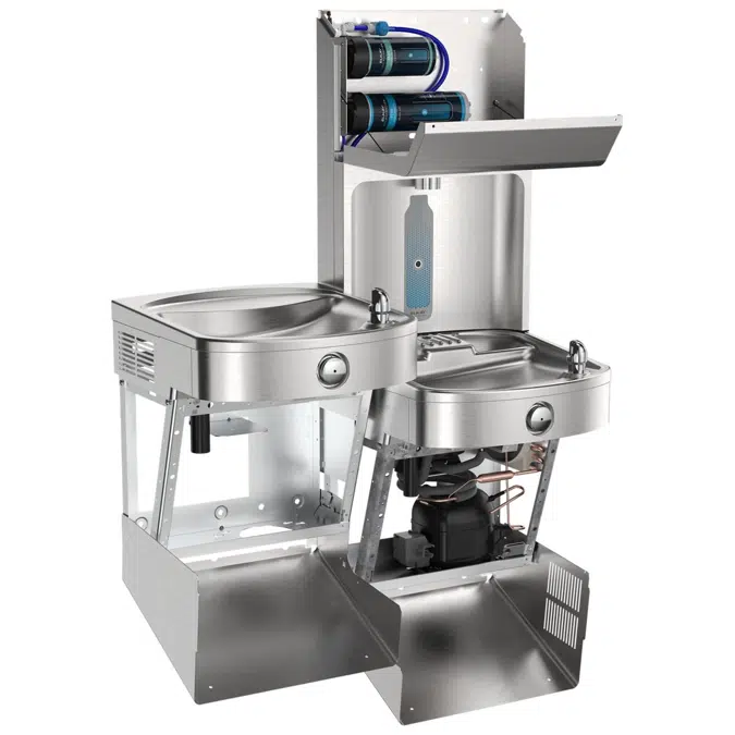 Elkay Pro Filtration® VandalResistant Connected Bottle Filling Station&BiLvl ADA Clr Refrig Ultra-Cap Lead+Sed Preflt SS. Chilling Capacity of 8.0 GPH (gallons per hour) of 50 F drinking water, based on 80 F inlet water and 90 F ambient, per ASHRAE 18 testing. Furnished with Vandal Resistant bubbler. Electronic Bottle Filler Sensor with Mechanical Front Bubbler Button activation. Product shall be Wall Mount (On Wall), for Indoor applications, serving 2 station(s).