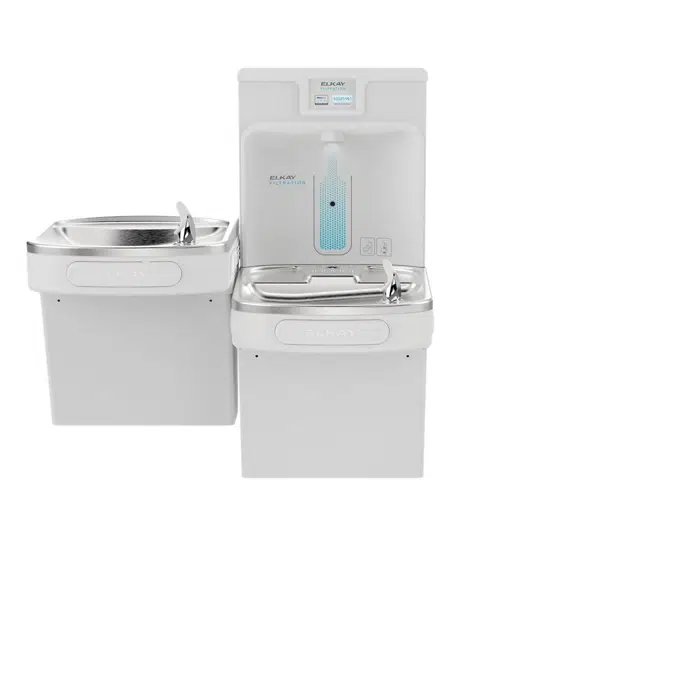 Enhanced Filtered Bottle Filling Station & Bi-Level ADA Cooler Arctic White PFOA/PFOS & Lead Reduction Drop Down Wrapper. Chilling Capacity of 8.0 GPH (gallons per hour) of 50° F drinking water, based on 80° F inlet water and 90° F ambient, per ASHRAE 18 testing.Features shall include Filtered, Green Ticker™, Hands Free, Laminar Flow, Real Drain, Visual Filter Monitor, Quick Filter Change, Antimicrobial*, Automatic Filter Status Reset, Energy Savings.Furnished with Flexi-Guard ® Safety Bubbler. Electronic Bottle Filler Sensor with Electronic Front and Side Bubbler Pushbar activation. Product shall be Wall Mount (On Wall), for Indoor applications, serving 2 station(s). Unit shall be certified to UL 399 and CAN/CSA C22.2 No. 120.