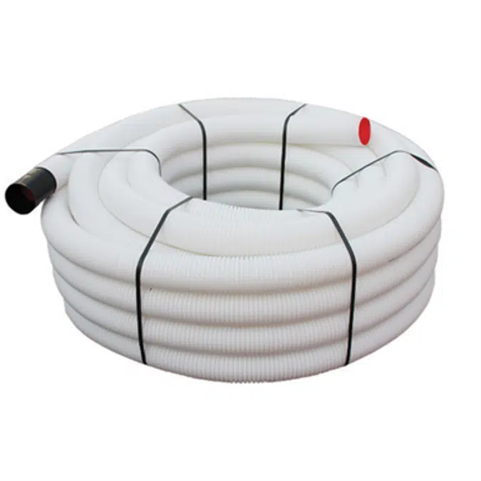 Flexible pipe DN 75, white color, with antistatic and antibacterial treatment (integrated antimicrobial hygienic function guaranteed for the entire life cycle of the product by "Sanitized" technology). For installation under the floor, in false ceilings or on walls. Made of polyethylene; corrugated exterior; smooth interior. Roll length 50 m.