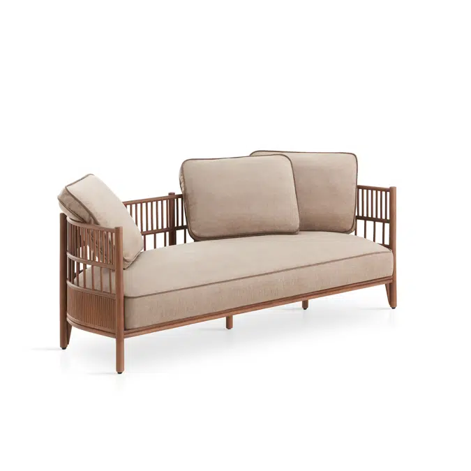 Sofa with structure made of peeled and tinted natural rattan of 32 mm/1.26” diameter. Backrest and sides manufactured in peeled and tinted natural rattan of 10 mm/0.4” diameter. Finished with a three step water-based coating (dye, base coat and top coat) highly resistant to solar radiation thanks to UV filters. Possibility of customization through a wide variety of fabrics. Protective caps.