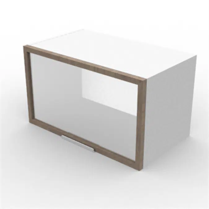 Kitchen wall bridge cabinet, top unit to be suspended above the counter space, in 330 mm depth. Available in 350 mm or 450 mm height and 600 mm width. Wall carcasse made of core board MR MFC Fimaplast (moisture resistant melamine faced chipboard) 16 mm thickness, decorative finish on both sides, PVC 1 mm front edging and PVC 0,4 mm other edgings. Back board MCF Fimaplast 6 mm White Decor both sides or design/kraft, including one shelf in 450 mm wall bridge unit. Wooden dowel and allen key screw for assembly, shrink-wrap plastic flat packed. Mechanised for hidden hanger, pre-drill for hinges and shelf support included. Available in two finishes: White 020 Blanco Medio SIII or 890 Aluminium SIII. Wall unit designed to be completed with one lift-up glass cabinet door.