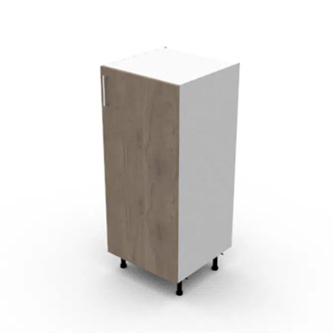 Kitchen mid larder cabinet, tall cupboard in 580 mm depth. Available in 1300 mm or 1400 mm height and 600 mm width. Wall carcasse made of core board MR MFC Fimaplast (moisture resistant melamine faced chipboard) 16 mm thickness, decorative finish on both sides, PVC 1 mm front edging and PVC 0,4 mm other edgings. Back board MCF Fimaplast 6 mm White Decor both sides or design/kraft, including two shelves. Wooden dowel and allen key screw for assembly, shrink-wrap plastic flat packed. Mechanised for hidden hanger, pre-drill for hinges and shelf support included. Available in two finishes: White 020 Blanco Medio SIII or 890 Aluminium SIII. Mid-larder unit designed to be completed with one hinged paneled right door.