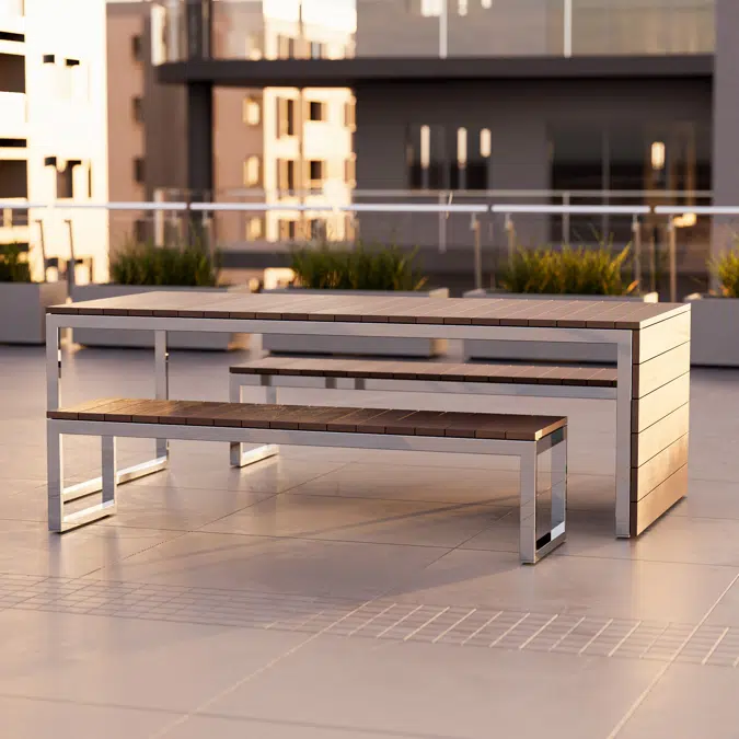 Duo Benches, Tables & Table Ensembles are a harmonious display of yin and yang as wood and stainless steel intersect to form a group that transcends its parts. Options include FSC®-certified hardwood slats, standard and bar-height tables, and ADA compliant ensemble designs.