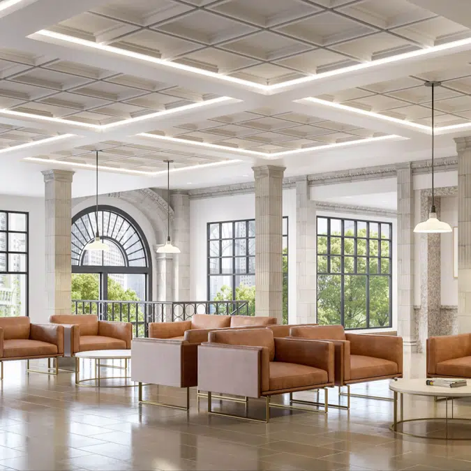 Recessed Square Molded Acoustic Tiles are a fresh take on traditional coffered