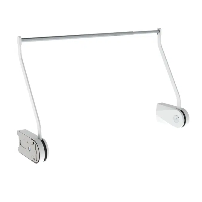 A simple push of a button lowers the clothes rod by 112 cm. A person of normal height can easily reach up to 190 cm which means the clothes rod in its upper position can be 300 cm above the floor. Thus, the lower part of the wardrobe can be used for another clothes rod or other form of storage.