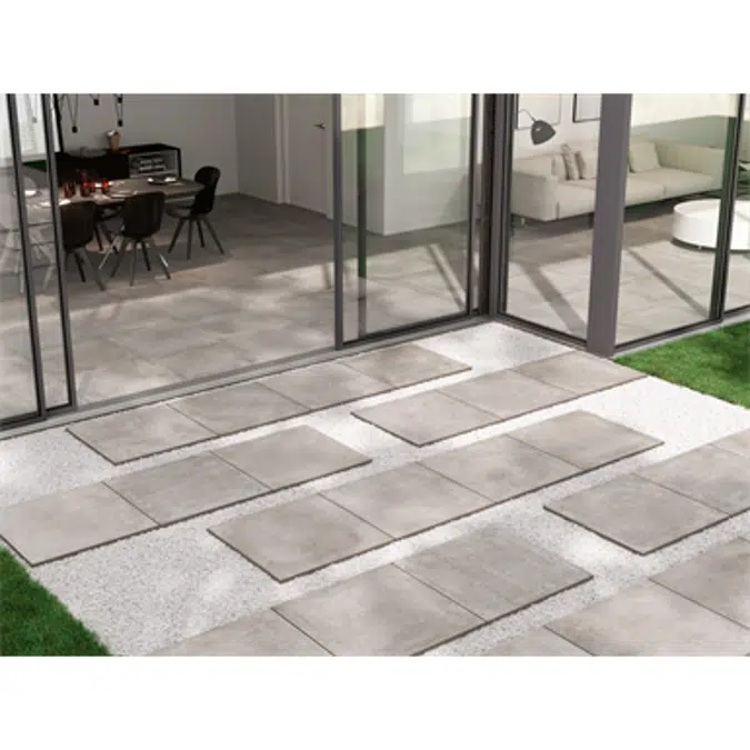 Porcelain tile, cement effect, five colours and five different sizes available. Water absorption E<0,5 %, BIa group according to UNE-EN 14411. Step tiles, skirting and special pieces available. H&C Tiles photo-catalytic coating with air purifying, self-cleaning, and antibacterial properties available.
