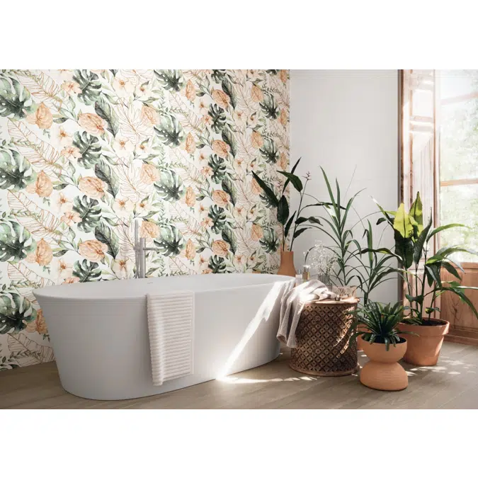 White body rectified tile, matte white finish, two reliefs with a design of soft waves (Bruselas and Gante) and a piece with effect plant design wallpaper (Charleroi). Smooth or relief finish. Water absorption E>10%, BIII group, according to UNE-EN 14411. H&C Tiles photo-catalytic coating with air purifying, self-cleaning, and antibacterial properties available.
