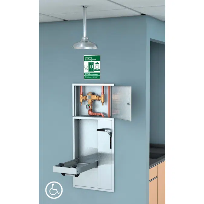 Application: Recessed barrier-free eye/face wash and shower safety station with ceiling mounted exposed shower head, drain pan, and emergency thermostatic mixing valve. Stainless steel cover provides attractive appearance and protects unit when not in use. When activated, cover serves as pan to collect waste water and return it into unit for drainage. Rather than connecting to building drainage system, unit has 1” IPS stainless steel drain on front of unit for waste water. Front drain provides for less costly installation while facilitating regular testing of unit.