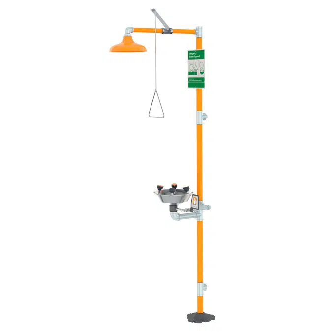Application: Combination WideArea™ eye/face wash and shower safety station. Four GS-Plus™ spray-type outlet heads deliver a flood of water over a wide area of coverage for complete rinsing of eyes and face.