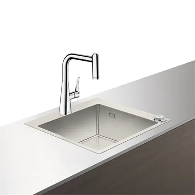 • Surfaces: - 43207000 Chrome - 43207800 Stainless Steel Finish Specification: • consists of: built-in sink, 2-hole single lever kitchen mixer, control unit, hose box, automatic waste and overflow set • material sink: stainless steel • number of bowls: 1 main bowl • tap hole and hole for control unit are pre-drilled • sink depth: 190 mm • cut-out dimensions: 530 x 480 mm • cabinet size: 60 cm • type of installation: flat on the countertop (self-rimming) or flush-mount installation • position overflow: on the right side of the bowl • tap ledge reinforcing for a tight and stable seating of the kitchen mixer • corner radius: 10 mm • connection type: G ⅜ connections • connection dimension: DN15 • suitable for continuous flow water heaters • ceramic cartridge • MagFit magnetic shower support • integrated non-return valve • swivel range adjustable in 2 steps to 110° or 150° • laminar spray and shower spray • ComfortZone 220 • lockable shower spray, spray returns automatically through handle closing • sBox for quiet, smooth and protected hose guidance in the cabinet, under the countertop • extension length up to 76 cm • push of control unit: intuitive start and stop function of the water flow, turn: automatic drain operation • maximum flow rate at 3 bar: 7 l/min