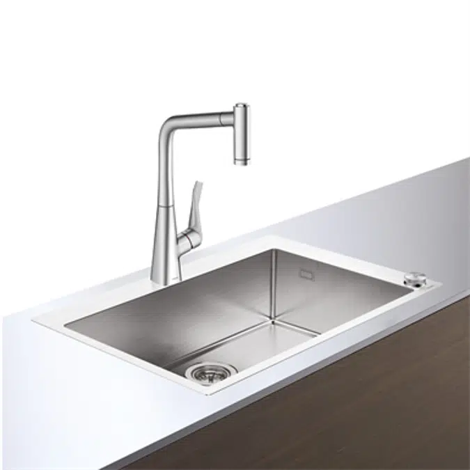 • Surfaces: - 43209000 Chrome - 43209800 Stainless Steel Finish Specification: • consists of: built-in sink, 2-hole single lever kitchen mixer, control unit, hose box, automatic waste and overflow set • material sink: stainless steel • number of bowls: 1 main bowl • tap hole and hole for control unit are pre-drilled • sink depth: 190 mm • cut-out dimensions: 740 x 480 mm • cabinet size: 80 cm • type of installation: flat on the countertop (self-rimming) or flush-mount installation • position overflow: on the right side of the bowl • tap ledge reinforcing for a tight and stable seating of the kitchen mixer • corner radius: 10 mm • connection type: G ⅜ connections • connection dimension: DN15 • suitable for continuous flow water heaters • ceramic cartridge • MagFit magnetic shower support • integrated non-return valve • swivel range adjustable in 2 steps to 110° or 150° • laminar spray and shower spray • ComfortZone 320 • lockable shower spray, spray returns automatically through handle closing • sBox for quiet, smooth and protected hose guidance in the cabinet, under the countertop • extension length up to 76 cm • push of control unit: intuitive start and stop function of the water flow, turn: automatic drain operation • maximum flow rate at 3 bar: 7 l/min