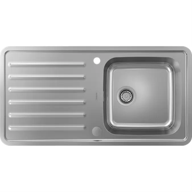• Surfaces: - 43338800 Stainless Steel Specification: • consists of: built-in sink, automatic waste set with siphon • cut-out dimensions: 955 x 485 mm • material: stainless steel • number of bowls: 1 main bowl • with drainage • tap hole and hole for pop-up waste control are pre-drilled • orientation: reversible • cabinet size: 50 cm • type of installation: flat on the countertop (self-rimming) or flush-mount installation • position overflow: on the side of the bowl under drainboard • tap ledge reinforcing for a tight and stable seating of the kitchen mixer • corner radius: 70 mm • sink depth: 210 mm