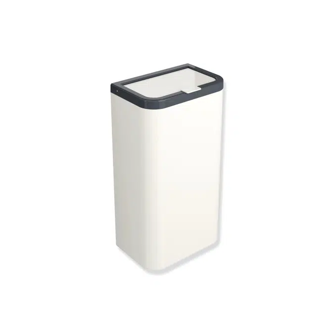 Range 477 Wastepaper bin - rectangular shaped container with large radii - serves as waste bin for used paper towels - Capacity approx. 25 l - concealed, integrated bag holder - lid with lifting flap - 281 mm wide, 505 mm high and 181 mm deep - For wall mounting - Body and cover made of high-gloss polyamide in HEWI colour 99 (pure white) - Frame element made of high-gloss polyamide according to HEWI colour chart - including corrosion-free HEWI fixing material