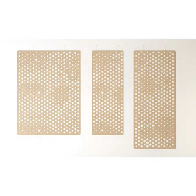 A sound-absorbing room divider that displays a gradient of circle-shaped perforations while preserving its acoustic properties: keep the noise down and shield users from visual distractions.